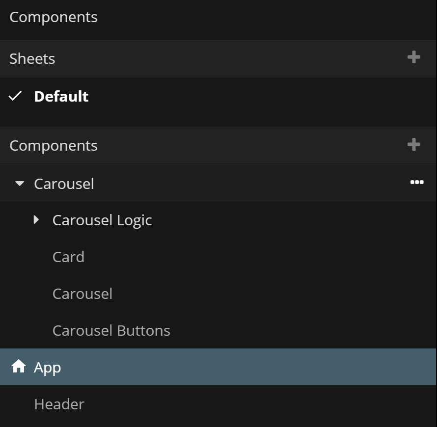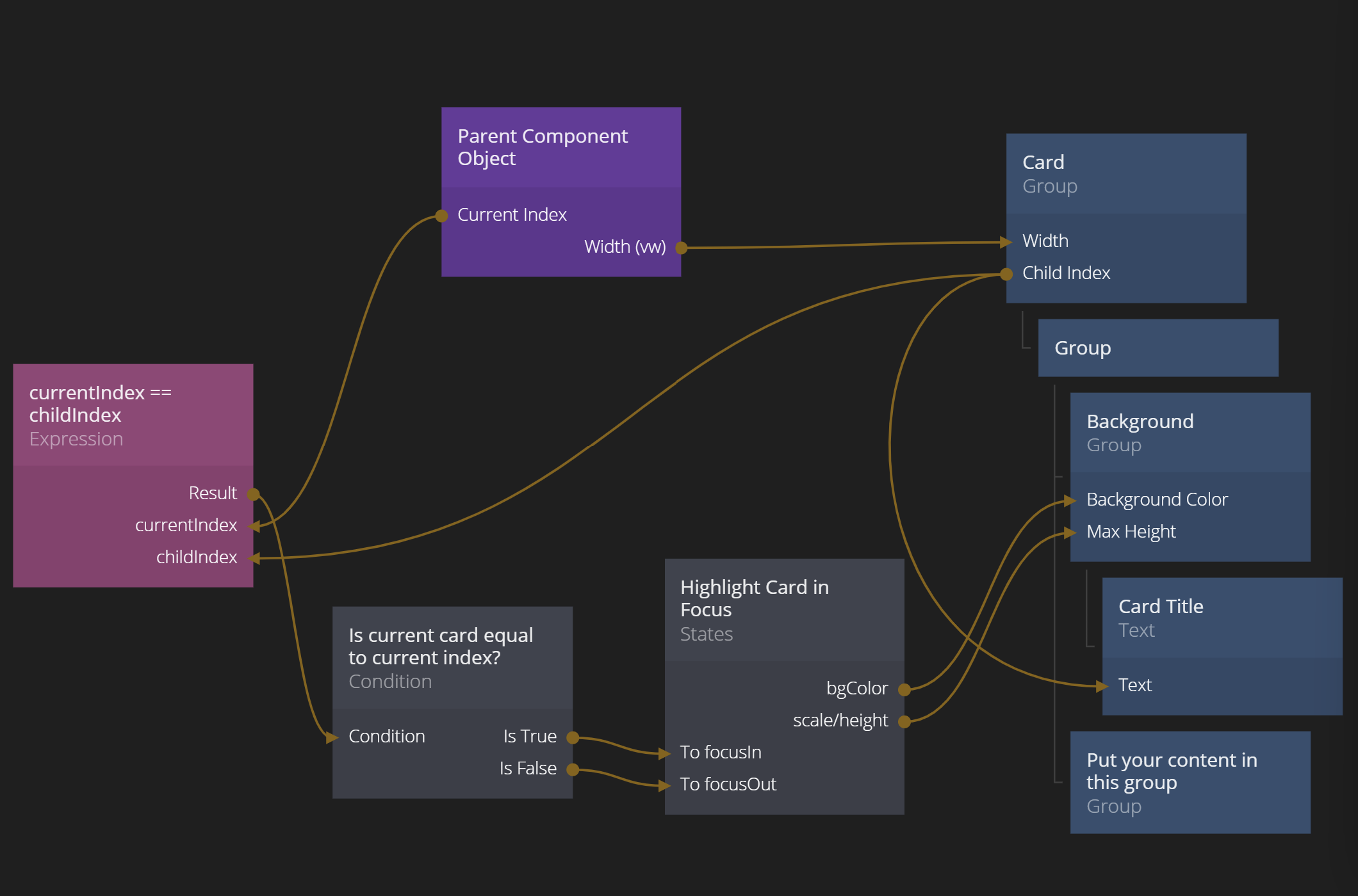 This component is the template for the card that represents an item in the Carousel list. You should base your own Carousel item on this Card, either by modifying this directly or making a copy of it. Feel free to change the structure of the component, however it's important to keep the Parent Component node and have the Width output connected to the Width of the main container of the Card. Also note the selection logic if you want the Card to change appearance if it's selected.